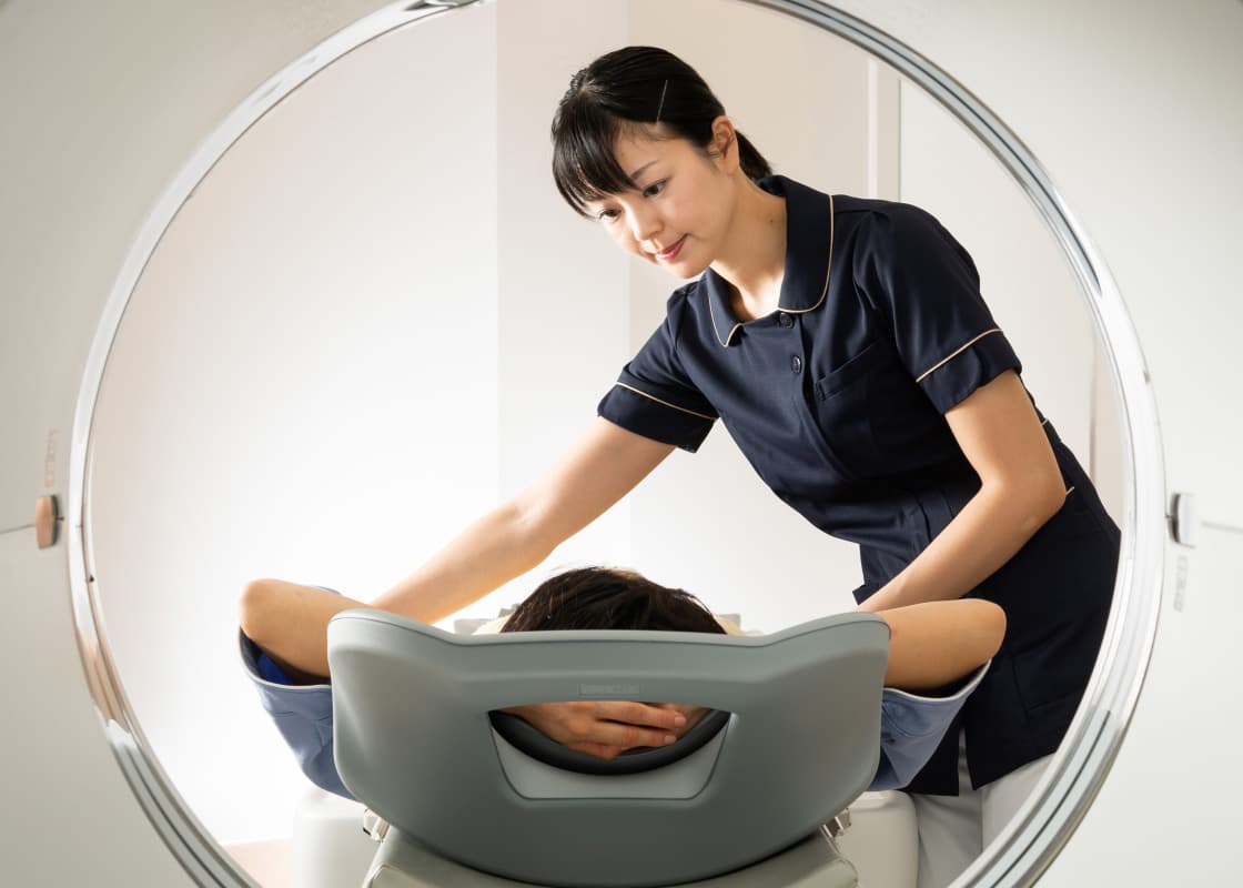 ベッドに仰向けで寝ていただき、MRI検査を行います。検査中は大きな音がしますので、耳栓等をご用意いたします。CT検査と同様に、痛みなどはありません(狭い所が苦手な方はスタッフにお申し付けください)。